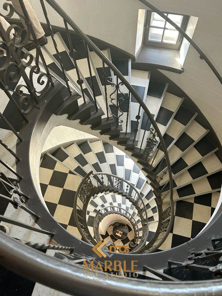 This marble staircase design looks perfect in black and white colour. On top of the combination of colours, the spiral staircase enhances the pattern. The spiral black and white marble staircase adds a sense of grandeur and luxury to the space.